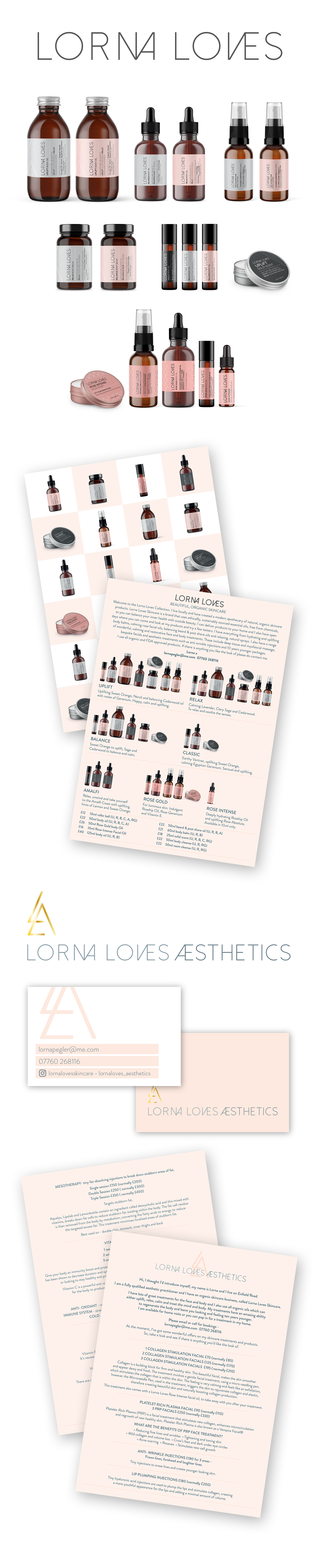Branding, packaging, stationery and promotional literature for Lorna Loves and Lorna Loves Aesthetics.